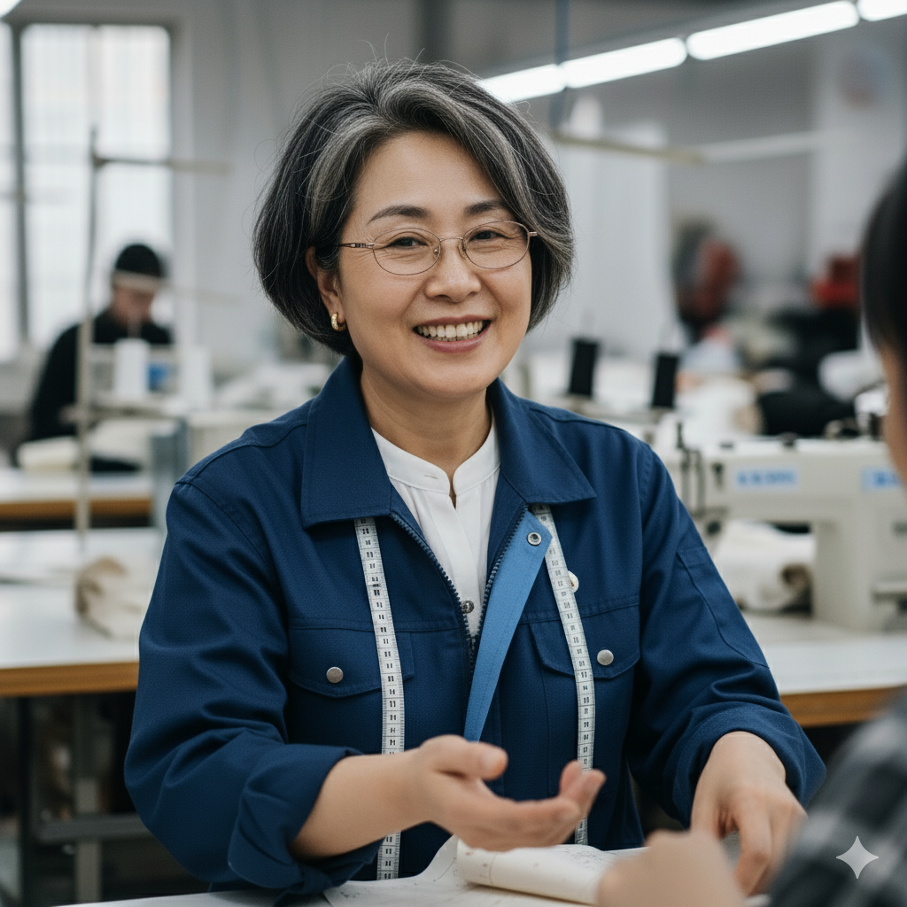 She have almost 20 years of experience. Back to 20 years ago, She is a worker in a state-owned garment factory, and her work is serious and responsible. After the state-owned factory was restructured, she opened a local tailor shop to customize clothes for customers. from small local brands to giant international brands. A very fun, kinda and responsible person to communicate with and will always try her best to achieve clients’ requests. I would say the factory can not operate without her.
